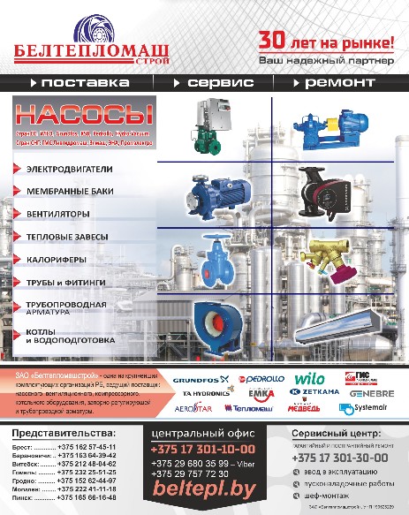 ЗАО "Белтепломашстрой"Минск, 220015, ул. Пономаренко, 35А-119Официальный сайт:Время работы:Пн-Чт с 8.00 до 17.00Пт с 8.00 до 15.45Сб-Вс выходнойКонтактные телефоны:8 (017) 301-10-00 – многоканальный (10 линий)8 (029) 680-35-99 – Velcom/Viber8 (029) 757-72-30 – MTS8 (025) 600-27-25 – Life:)Электронная почта:beltepl@beltepl.by – Отдел продажimport@beltepl.by – Насосы иностранных производителейnasos@beltepl.by – Насосы производства стран СНГarmatura@beltepl.by – ТПА и котельное оборудованиеvent@beltepl.by – Вентиляционное оборудованиеСЕРВИСНЫЙ ЦЕНТРТел./факс: 8 (017) 301-30-00,8 (029) 680-35-99, 757-72-30Email: service@beltepl.byРеквизиты: УНП 190526229
